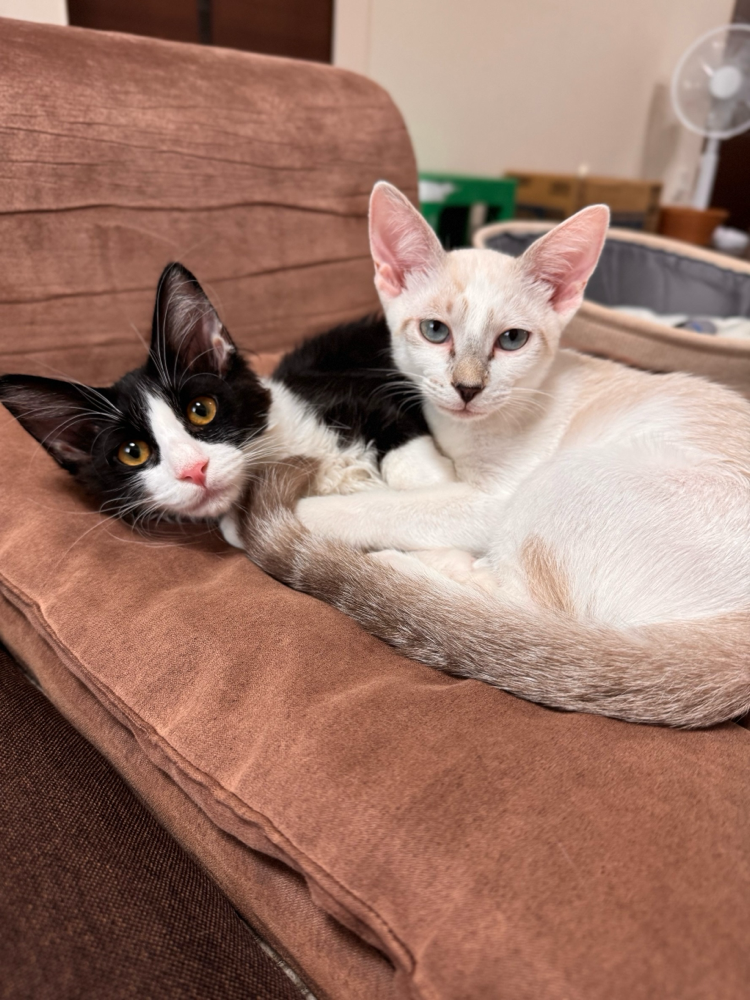 ポポ、チャム、大きくなって最近は活発に走り回って元気いっぱいで大変ですが、寝てる姿はまだまだ子猫でかわいいです🥰毎日癒されてます🥹色々ありがとうございました☺️出会えて家族皆んな喜んでます